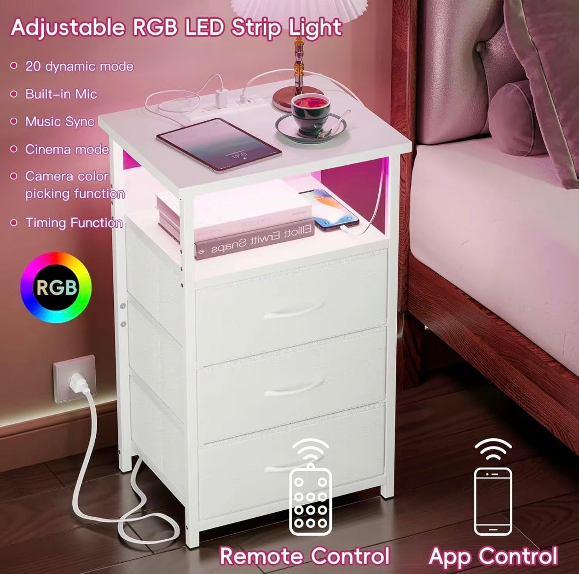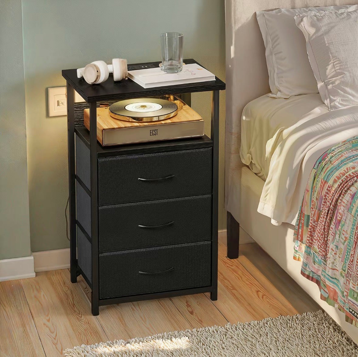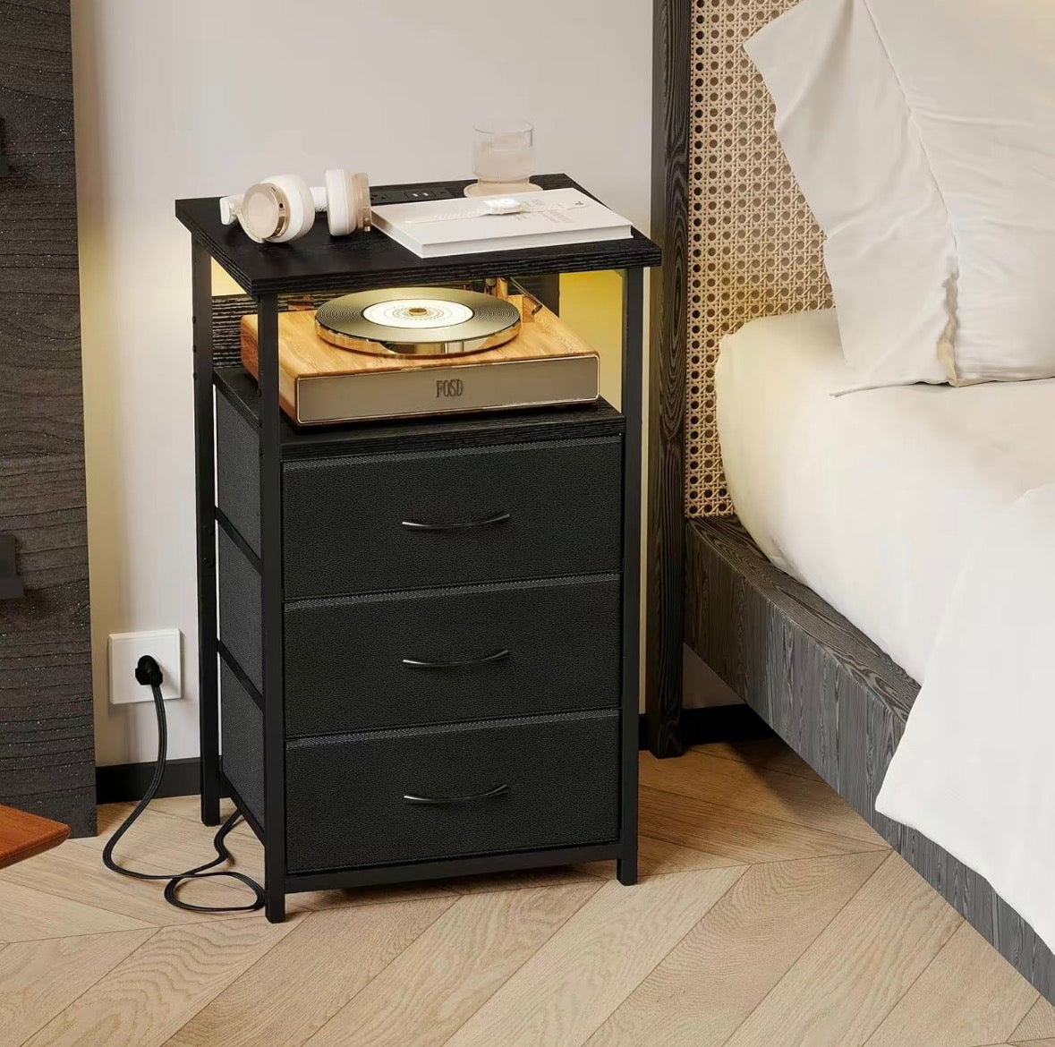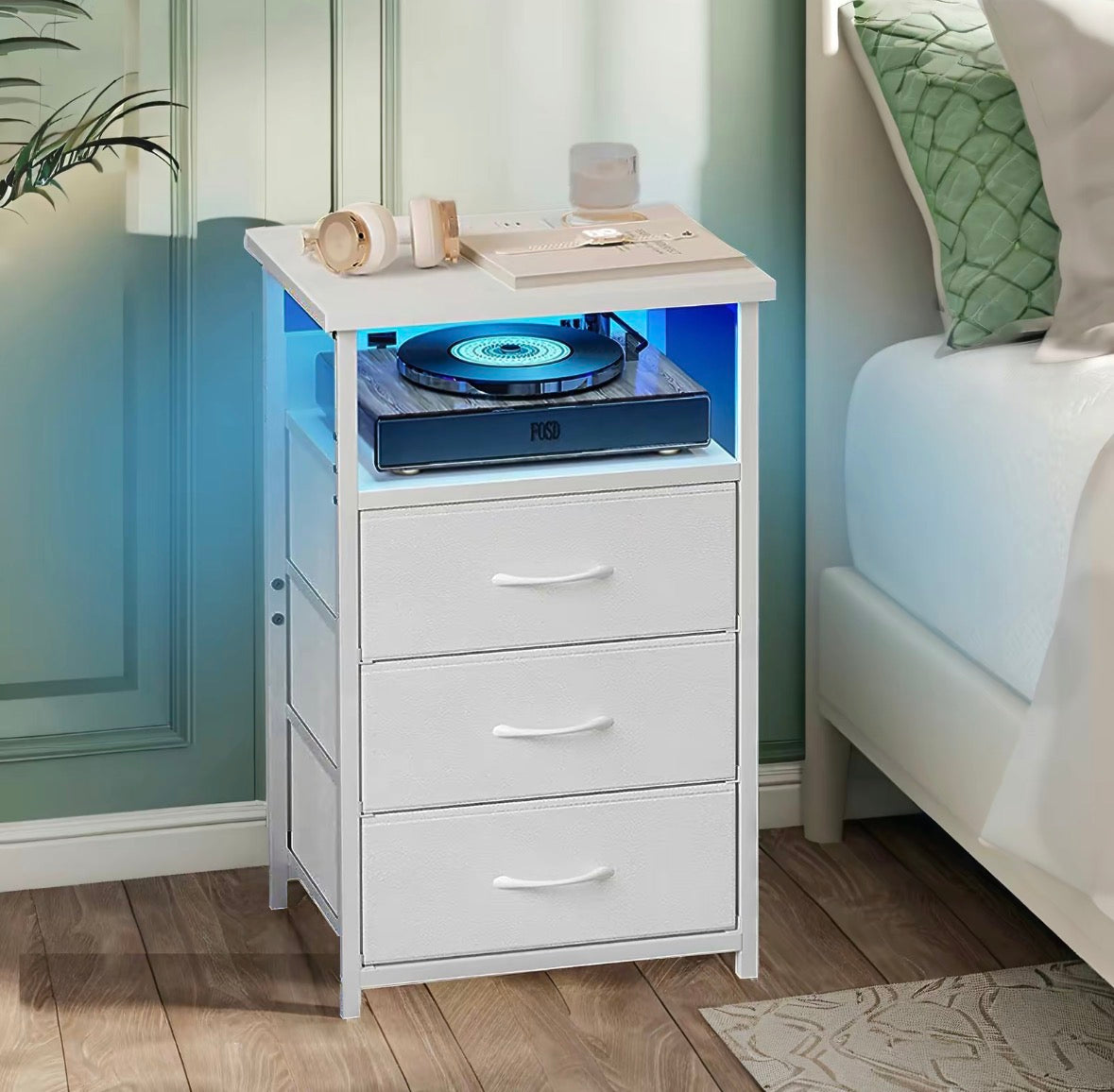 This modern nightstand combines style, function, and a touch of tech, featuring a dedicated shelf to showcase your turntable with soft ambient LED lighting that creates a warm, inviting glow. Below, three spacious drawers provide plenty of room to organize everyday essentials, keeping your space clean and clutter-free. With its sleek design and versatile look, it’s the perfect addition for music lovers who want a bedside piece that’s both practical and visually striking.